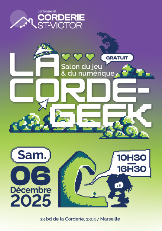 Embarquez pour la 3eᵉ édition du Salon du Jeu et du Numérique — La Cordegeek, organisé par : Le centre social Corderie St Victor !