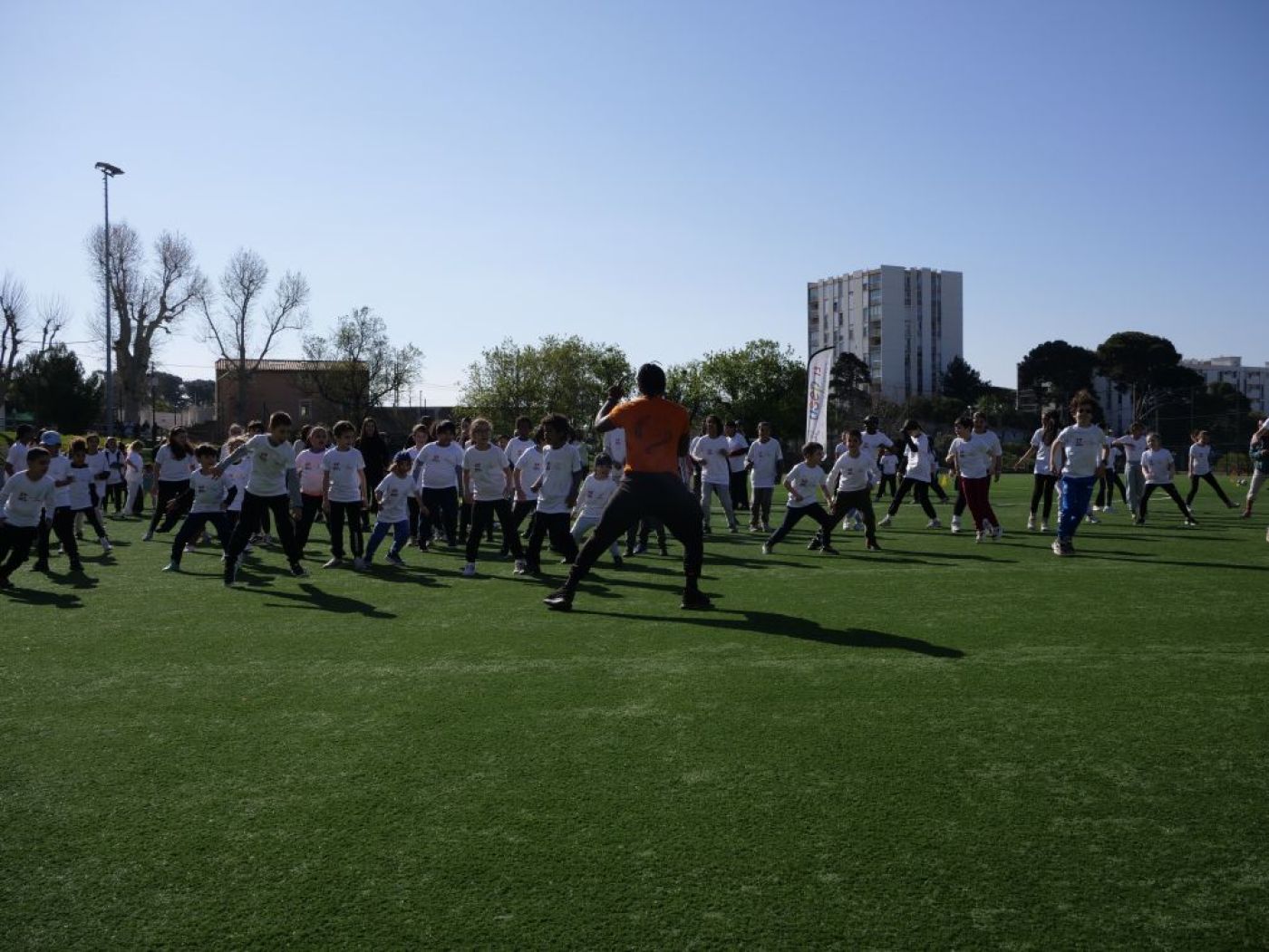Sous un doux soleil matinal, la journée a débuté par un échauffement collectif, comme toute activité sportive se doit de l'être. Porté par Lionel, chargé de mission à l'USEP 13, l'ensemble des enfants présents a répété ses gestes avec assiduité. Après cette mise en bouche, le cœur battant, chaque groupe a pu explorer une pratique sportive durant 20 minutes avant de rejoindre l'atelier suivant.