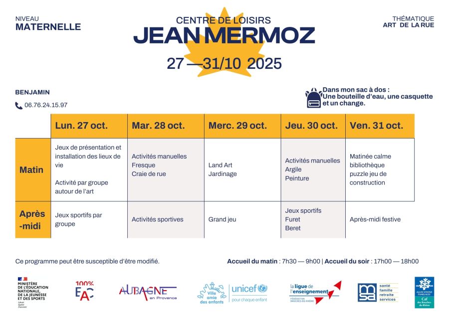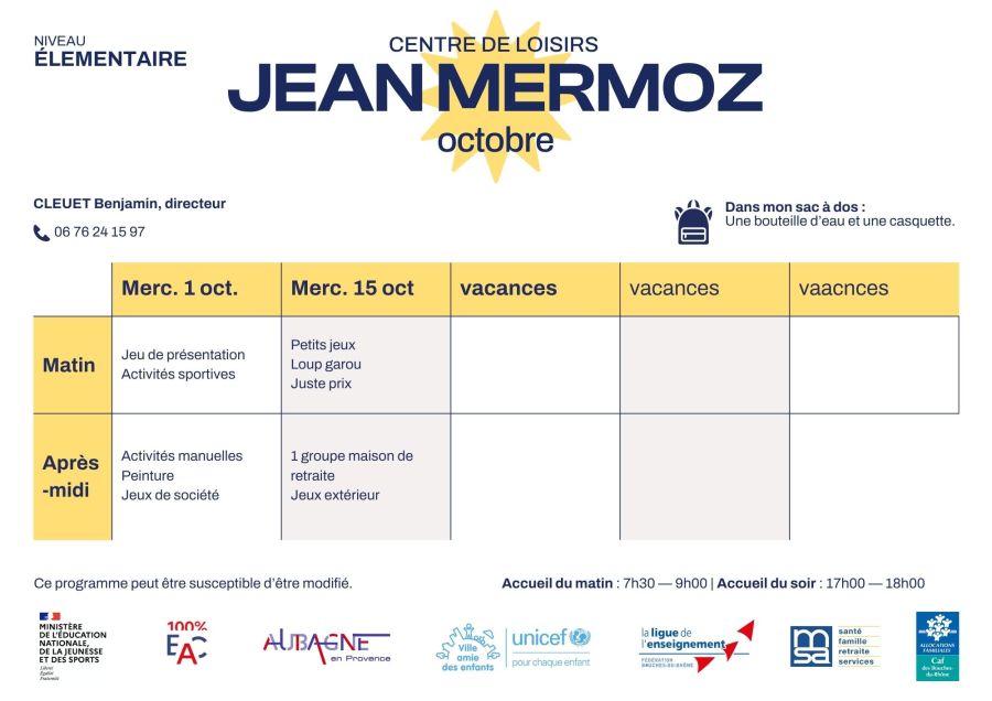 Situé au cœur d’Aubagne, le centre de loisirs accueille les enfants dans un cadre convivial et sécurisé. Il propose des activités éducatives, culturelles et sportives favorisant l’épanouissement et la découverte.