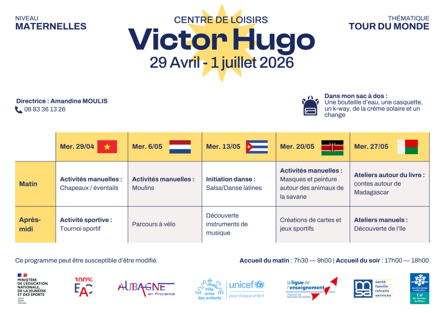 Découvrez le programmes des activités niveau maternelle pour les 2 semaines des vacances scolaires de printemps.