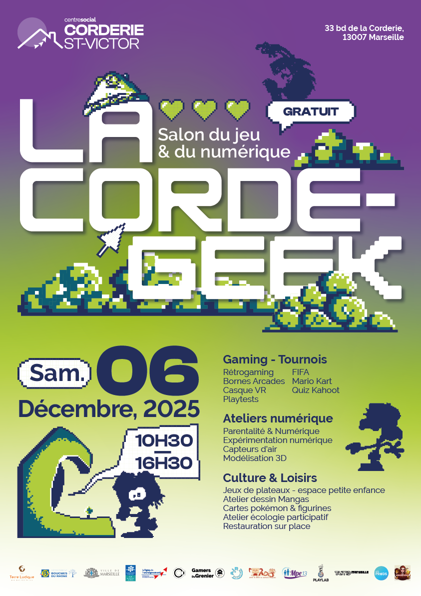 La Cordegeek, organisé par : Le centre social Corderie St Victor ! Venez découvrir un univers dédié au jeu sous toutes ses formes : jeux vidéo, jeux de société, créations numériques, ateliers interactifs et expositions immersives.