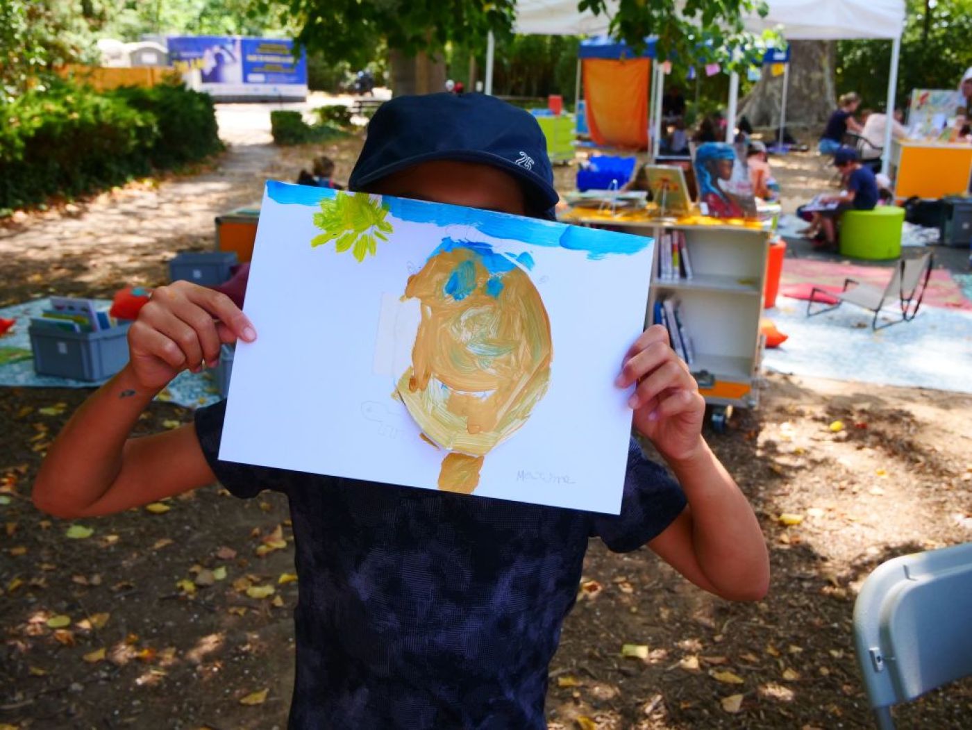 Le festival touche à sa fin. C'est au parc de la Maison Blanche (9e arrondissement) qu’on retrouve l’illustratrice italienne Lucia CALFAPIETRA pour un dernier atelier. “La liberté... c’est dans la tête !”. En proposant aux enfants de peindre leur autoportrait en couleurs, Lucia les incite à travailler l’imaginaire par l’illustration. Où se trouve la liberté ? Eh bien, elle peut être partout ! C’est ce qu’elle arrive à communiquer aux petits de nos centres de loisirs venus participer à l’atelier, montrant qu’être libre ça passe aussi par la pensée et par s’exprimer artistiquement. Derrière leur autoportrait se cache une autre page vierge sur laquelle ils peuvent dessiner ce qu’ils veulent : une chose aimée, un rêve, un paysage... le champ des possibles ! Entre deux coups de pinceaux, les enfants pouvaient aussi découvrir les livres de la bibliocyclette (Fotokino), bibliothèque itinérante qui vient s’ajouter à celle de la ville.