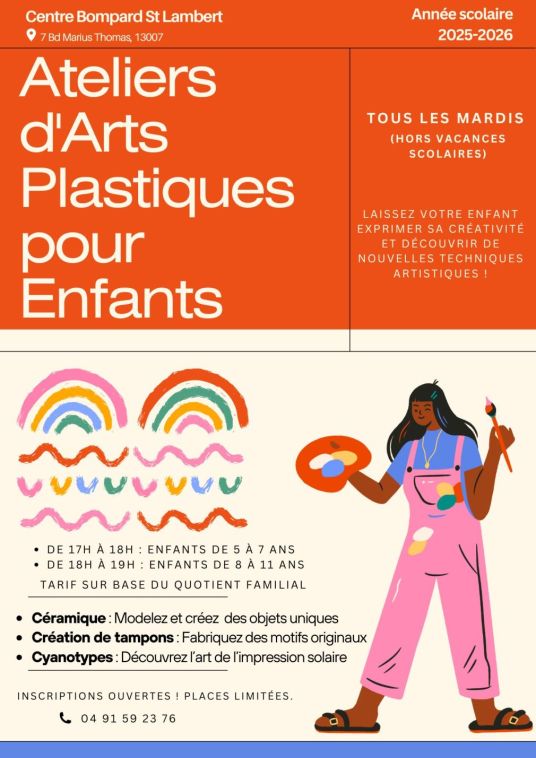 Chaque mardi, au Centre Bompard St Lambert, votre enfant est invité à explorer différentes techniques artistiques dans un atelier pensé pour éveiller sa curiosité et sa confiance en soi. Entre modelage, tampons et jeux de lumière, il développera sa motricité fine tout en s’amusant.